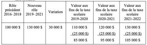 La variation entre l’évaluation municipale au rôle précédent et l’évaluation municipale au nouveau rôle est divisée par trois et additionnée à l’évaluation de l’année précédente. Le calcul est le même, que l’évaluation ait augmenté ou diminué. Le premier 25 000$ est supprimé de la valeur utilisée pour calculer la taxe scolaire.